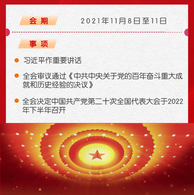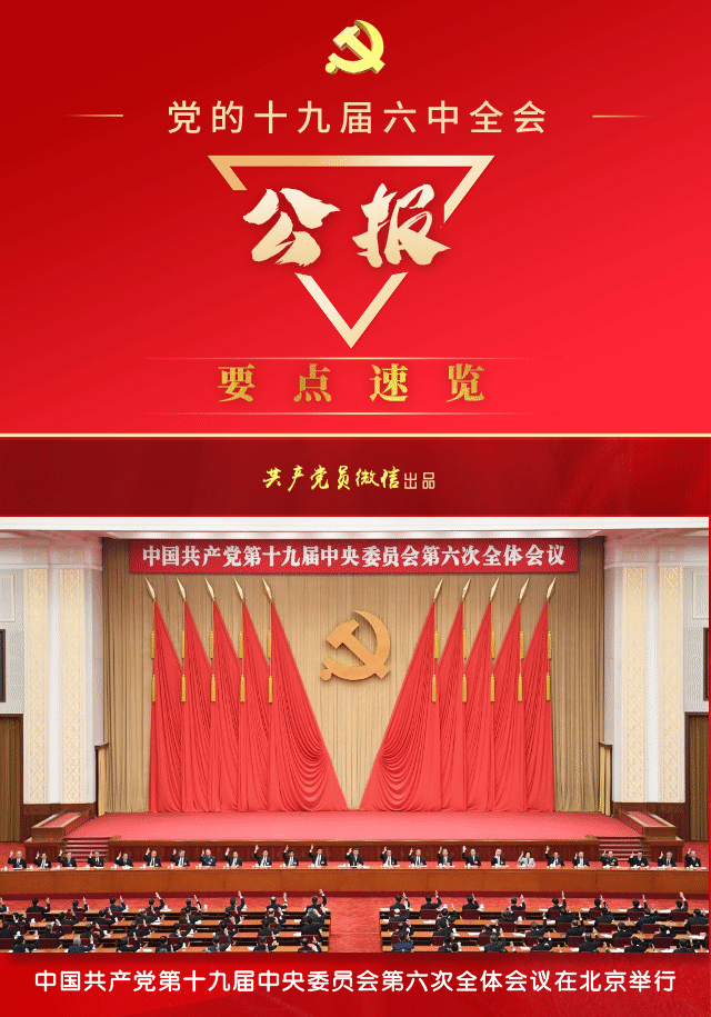 附:《中国共产党第十九届中央委员会第六次全体会议公报》全文 中国共产党第十九届中央委员会第六次全体会议公报 (2021年11月11日中国共产党第十九届中央委员会第六次全体会议通过) 中国共产党第十九届中央委员会第六次全体会议,于2021年11月8日至11日在北京举行。 出席这次全会的有,中央委员197人,候补中央委员151人。中央纪律检查委员会常务委员会委员和有关方面负责同志列席会议。党的十九大代表中部分基层同志和专家学者也列席会议。 全会由中央政治局主持。中央委员会总书记习近平作了重要讲话。 全会听取和讨论了习近平受中央政治局委托作的工作报告,审议通过了《中共中央关于党的百年奋斗重大成就和历史经验的决议》,审议通过了《关于召开党的第二十次全国代表大会的决议》。习近平就《中共中央关于党的百年奋斗重大成就和历史经验的决议(讨论稿)》向全会作了说明。 全会充分肯定党的十九届五中全会以来中央政治局的工作。一致认为,一年来,世界百年未有之大变局和新冠肺炎疫情全球大流行交织影响,外部环境更趋复杂严峻,国内新冠肺炎疫情防控和经济社会发展各项任务极为繁重艰巨。中央政治局高举中国特色社会主义伟大旗帜,坚持以马克思列宁主义、毛泽东思想、邓小平理论、“三个代表”重要思想、科学发展观、习近平新时代中国特色社会主义思想为指导,全面贯彻党的十九大和十九届二中、三中、四中、五中全会精神,统筹国内国际两个大局,统筹疫情防控和经济社会发展,统筹发展和安全,坚持稳中求进工作总基调,全面贯彻新发展理念,加快构建新发展格局,经济保持较好发展态势,科技自立自强积极推进,改革开放不断深化,脱贫攻坚战如期打赢,民生保障有效改善,社会大局保持稳定,国防和军队现代化扎实推进,中国特色大国外交全面推进,党史学习教育扎实有效,战胜多种严重自然灾害,党和国家各项事业取得了新的重大成就。成功举办庆祝中国共产党成立100周年系列活动,中共中央总书记习近平发表重要讲话,正式宣布全面建成小康社会,激励全党全国各族人民意气风发踏上向第二个百年奋斗目标进军的新征程。 全会认为,总结党的百年奋斗重大成就和历史经验,是在建党百年历史条件下开启全面建设社会主义现代化国家新征程、在新时代坚持和发展中国特色社会主义的需要;是增强政治意识、大局意识、核心意识、看齐意识,坚定道路自信、理论自信、制度自信、文化自信,做到坚决维护习近平同志党中央的核心、全党的核心地位,坚决维护党中央权威和集中统一领导,确保全党步调一致向前进的需要;是推进党的自我革命、提高全党斗争本领和应对风险挑战能力、永葆党的生机活力、团结带领全国各族人民为实现中华民族伟大复兴的中国梦而继续奋斗的需要。全党要坚持唯物史观和正确党史观,从党的百年奋斗中看清楚过去我们为什么能够成功、弄明白未来我们怎样才能继续成功,从而更加坚定、更加自觉地践行初心使命,在新时代更好坚持和发展中国特色社会主义。 全会提出,中国共产党自一九二一年成立以来,始终把为中国人民谋幸福、为中华民族谋复兴作为自己的初心使命,始终坚持共产主义理想和社会主义信念,团结带领全国各族人民为争取民族独立、人民解放和实现国家富强、人民幸福而不懈奋斗,已经走过一百年光辉历程。党和人民百年奋斗,书写了中华民族几千年历史上最恢宏的史诗。 全会提出,新民主主义革命时期,党面临的主要任务是,反对帝国主义、封建主义、官僚资本主义,争取民族独立、人民解放,为实现中华民族伟大复兴创造根本社会条件。在革命斗争中,以毛泽东同志为主要代表的中国共产党人,把马克思列宁主义基本原理同中国具体实际相结合,对经过艰苦探索、付出巨大牺牲积累的一系列独创性经验作了理论概括,开辟了农村包围城市、武装夺取政权的正确革命道路,创立了毛泽东思想,为夺取新民主主义革命胜利指明了正确方向。党领导人民浴血奋战、百折不挠,创造了新民主主义革命的伟大成就,成立中华人民共和国,实现民族独立、人民解放,彻底结束了旧中国半殖民地半封建社会的历史,彻底结束了极少数剥削者统治广大劳动人民的历史,彻底结束了旧中国一盘散沙的局面,彻底废除了列强强加给中国的不平等条约和帝国主义在中国的一切特权,实现了中国从几千年封建专制政治向人民民主的伟大飞跃,也极大改变了世界政治格局,鼓舞了全世界被压迫民族和被压迫人民争取解放的斗争。中国共产党和中国人民以英勇顽强的奋斗向世界庄严宣告,中国人民从此站起来了,中华民族任人宰割、饱受欺凌的时代一去不复返了,中国发展从此开启了新纪元。 全会提出,社会主义革命和建设时期,党面临的主要任务是,实现从新民主主义到社会主义的转变,进行社会主义革命,推进社会主义建设,为实现中华民族伟大复兴奠定根本政治前提和制度基础。在这个时期,以毛泽东同志为主要代表的中国共产党人提出关于社会主义建设的一系列重要思想。毛泽东思想是马克思列宁主义在中国的创造性运用和发展,是被实践证明了的关于中国革命和建设的正确的理论原则和经验总结,是马克思主义中国化的第一次历史性飞跃。党领导人民自力更生、发愤图强,创造了社会主义革