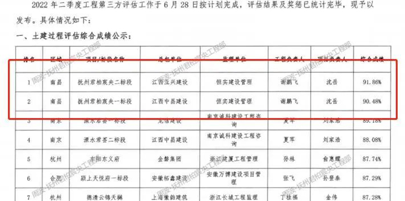 近日,由恒实建设管理股份有限公司承监的抚州君柏宸央项目,在中奥地产集团开展的第二季度深圳瑞捷三方飞行检查中,在中奥地产集团全国在建30个项目中脱颖而出,其中二标段综合得分91.86排名全国第一,一标段综合得分90.48全国排名第二,获得了业主单位的通报表扬及奖励。