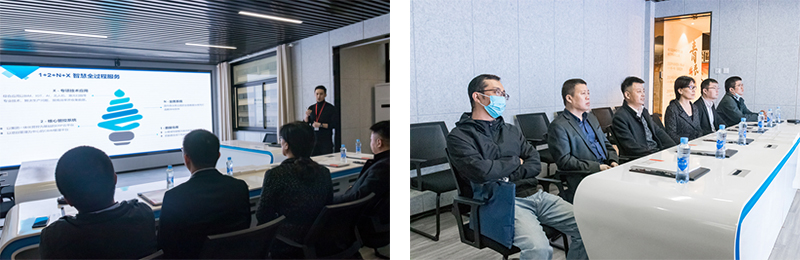 随后,参观了企业文化长廊、党建特色及荣誉室,听取了企业的发展历程及企业文化的介绍,对公司取得的成绩及发展表示认可和肯定。在企业指挥中心,技术研发中心秦川讲解了建筑产业智慧化云平台—筑慧云,结合IOT物联网、AI智能、5G大数据、BIM技术及ERP系统的管理,展示了如何实现过程数字化、结果可视化、管理数据化的应用。