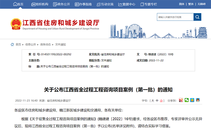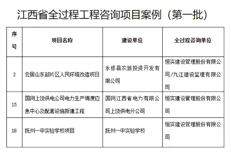 近日,根据《关于征集全过程工程咨询项目案例的通知》(赣建建〔2022〕16号)要求,经各设区市推荐、专家评审并公示无异议后,江西省住房和城市建设厅公布了“江西省全过程工程咨询项目案例(第一批)”名录。其中,恒实建设管理股份有限公司提供全过程工程咨询服务的云居山东部片区人民环境改造项目、国网上饶供电公司电力生产调度应急中心及配套设施新建工程、抚州一中实验学校项目3个项目入选。