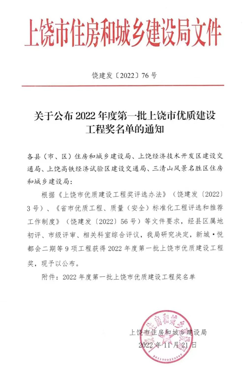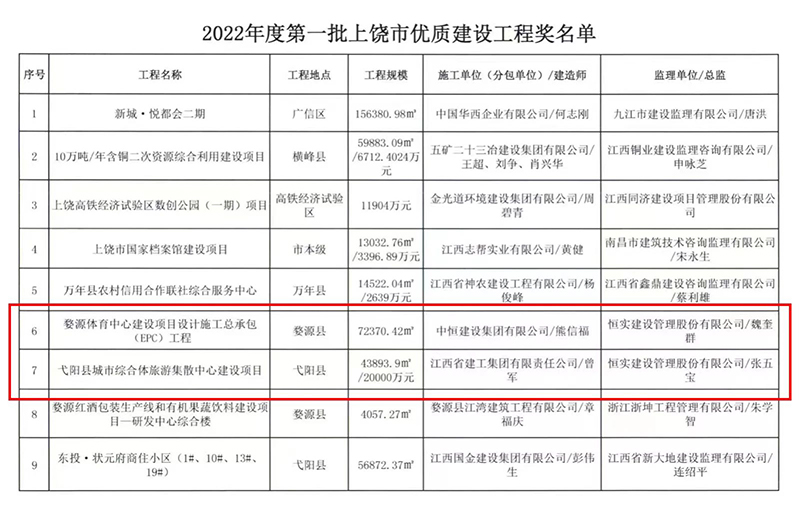 近日,根据《上饶市优质建设工程奖评选办法》(饶建发〔2022〕3号)、《省市优质工程、质量(安全)标准化工程评选和推荐工作制度》(饶建发〔2022〕56号)等文件要求,上饶市城乡建设局公布了2022年度第一批上饶市优质建设工程奖名单,其中在9项工程中,由恒实管理股份有限工程监理的婺源体育中心建设项目、弋阳县城市综合体体旅游集散中心建设项目榜上有名。