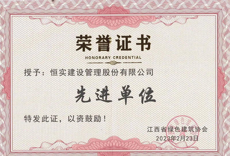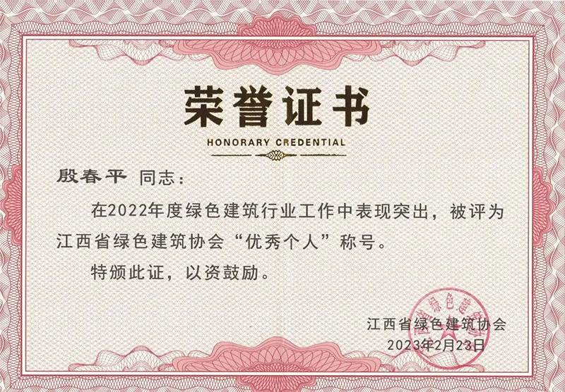 在本次江西省绿色建筑协会的年度表彰中,恒实建设管理股份有限公司荣获2022年度江西省绿色建筑协会“先进单位”称号,殷春平同志荣获2022年度江西省绿色建筑协会“优秀个人”称号。