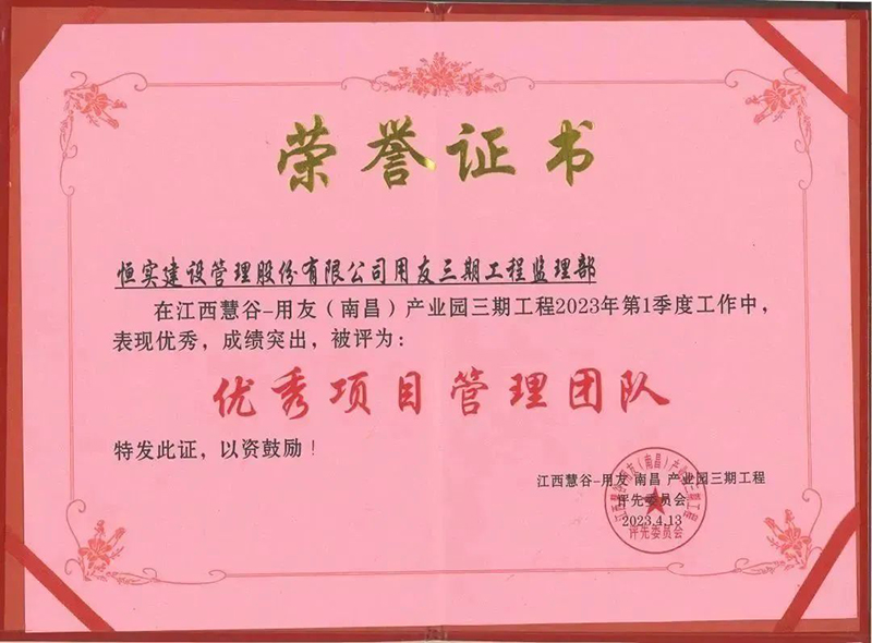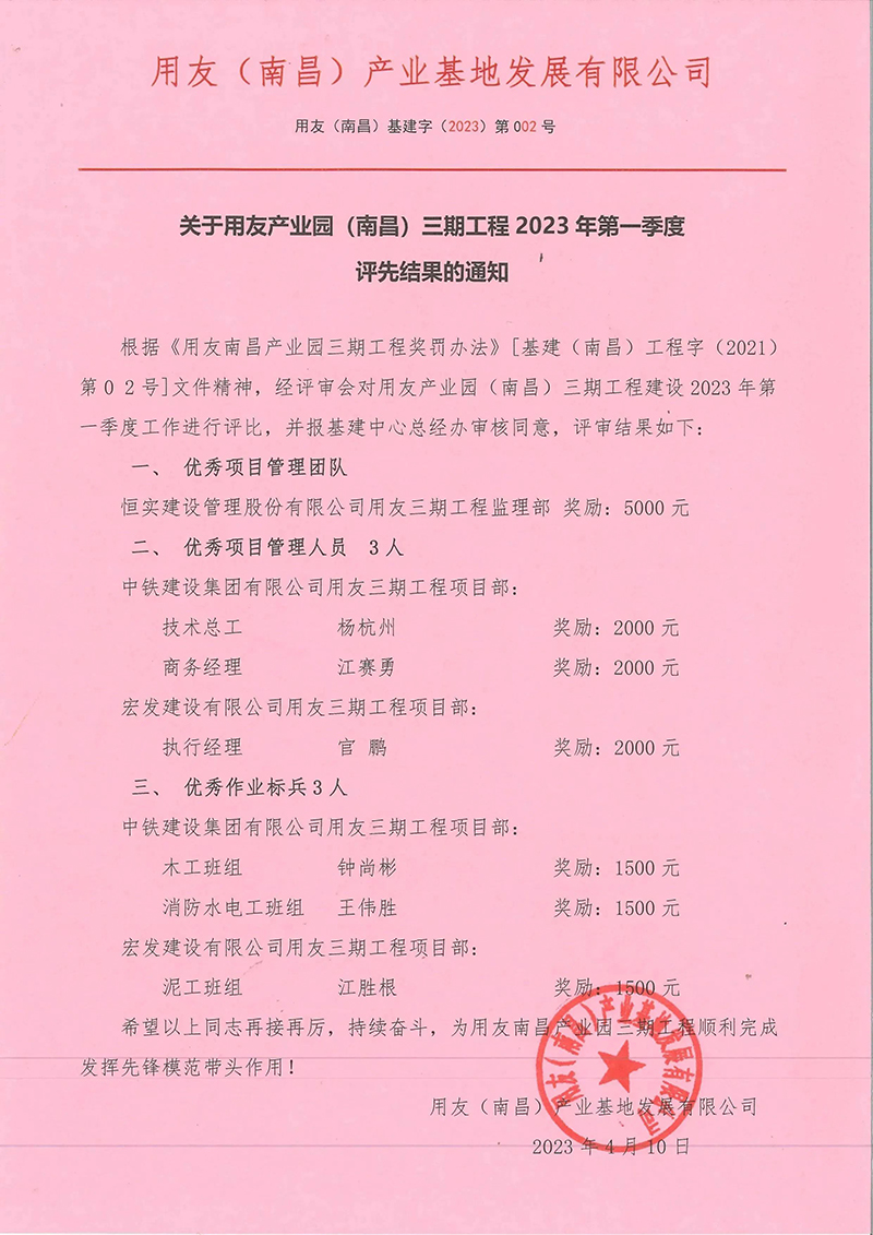 近日,江西慧谷-用友南昌产业园项目建设单位用友(南昌)产业基地发展有限公司发布了《关于用友产业园(南昌)三期工程2023年第一季度评先结果的通知》,经过评比,恒实建设管理股份有限公司项目监理部表现优秀、成绩突出,被评为:优秀项目管理团队。