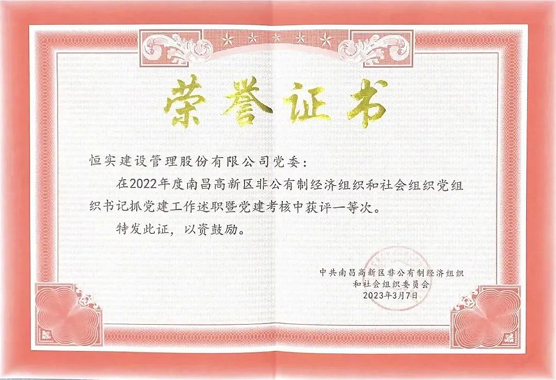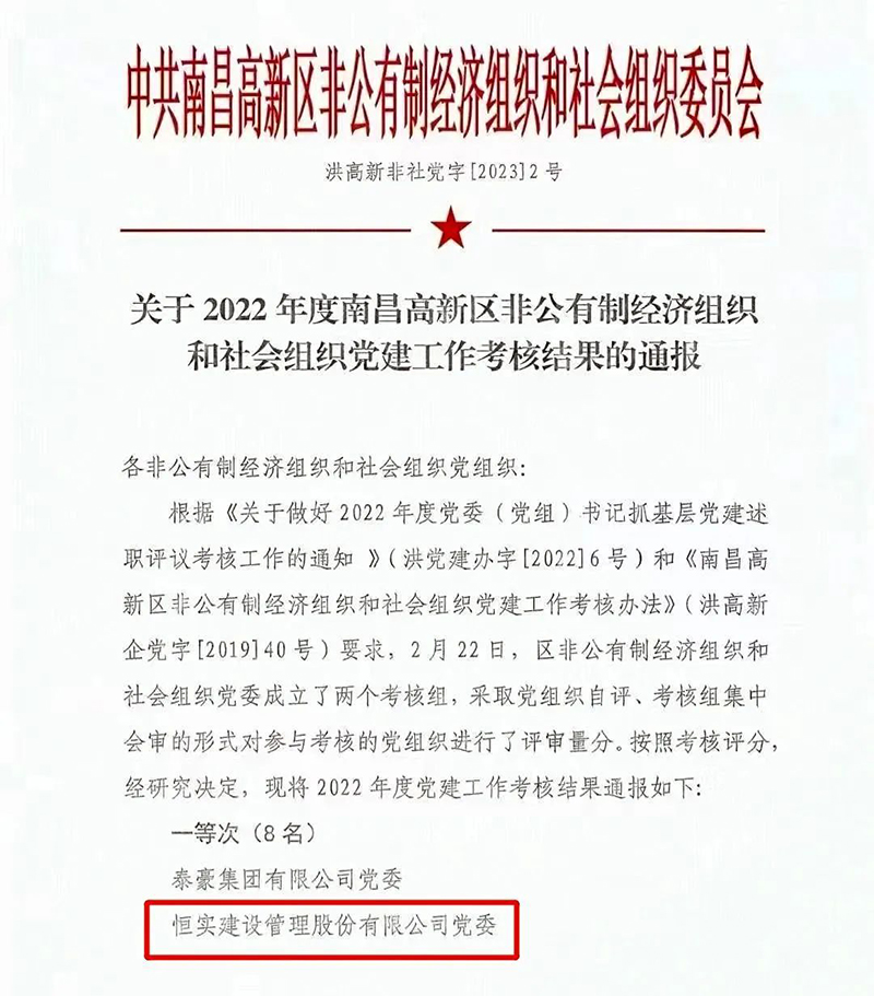 4月17日,中共南昌高新区非公有制经济组织和社会组织就2022年度南昌高新区非公党建工作考核进行了结果通报:中共恒实建设管理股份有限公司委员会荣获一等奖!自公司党组织成立以来,已连续四年荣获南昌高新区非公党建考核一等奖,充分体现了高新区对恒实股份党建工作的肯定与支持,也是全体恒实党员奋勇争先、积极进取的结果!