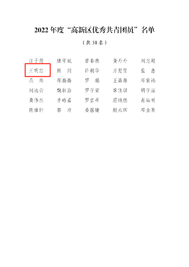 青春心向党,建功新时代。5月8日,为深入贯彻习近平新时代中国特色社会主义思想,为表彰先进,充分发挥示范引领作用,为激励各级团组织和广大团员、团干部踔厉奋发、创先争优,南昌高新区团工委组织召开了2023南昌高新区共青团表扬大会。会上,王明芯同志荣获2022年度“高新区优秀共青团员”表彰。