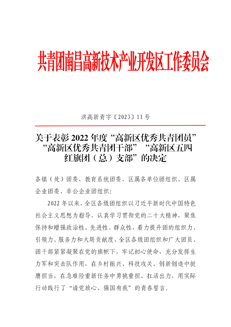 近日,共青团南昌高新技术产业开发区工作委员会发布《关于表彰2022年度“高新区优秀共青团员”“高新区优秀共青团干部”“高新区五四红旗团(总)支部”的决定》。其中,恒实建设管理股份有限公司王明芯同志荣获高新区2022年度“全区优秀共青团员”荣誉称号。
