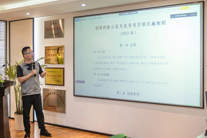 江西科晨研发中心项目刘平作了成果分享并对加强现场安全、质量、进度的监督管控做了分享,项目期间起草编制了《安全质量进度管理实施细则》,并通过业主审核后颁布执行,使项目建设过程安全有序推进。