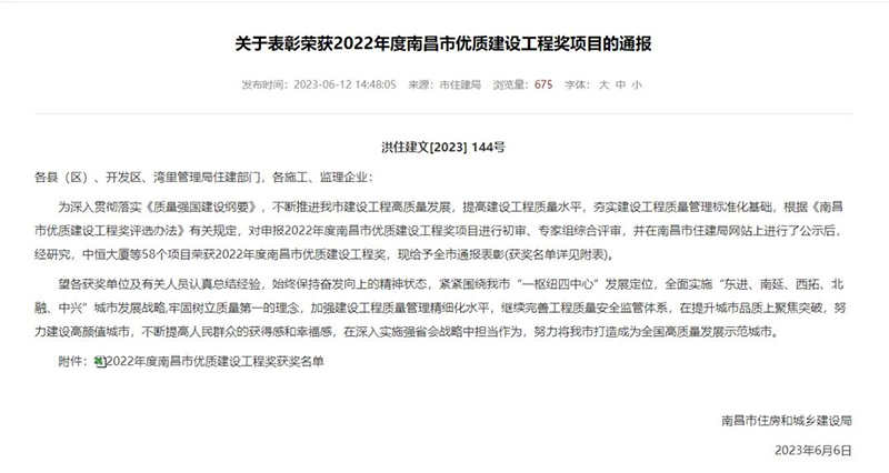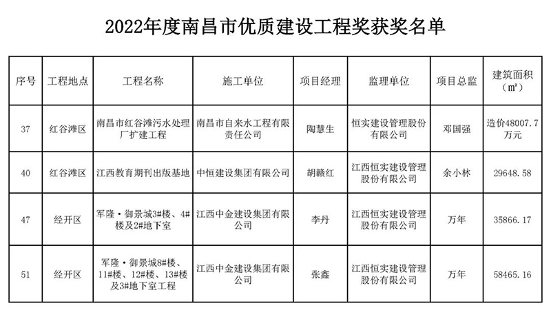近日,南昌市住房和城乡建设局发布了《关于表彰2022年度南昌市优质建设工程奖获奖项目的通报》,由恒实建设管理股份有限公司提供监理服务的:南昌市红谷滩污水处理厂扩建工程、江西教育期刊出版基地、军隆·御景城3#楼、4#楼及2#地下室、军隆·御景城8#楼、11#楼、12#楼、13#楼及3#地下室工程,4个项目获得表彰,被评为“2022年南昌市优质建设工程奖”。