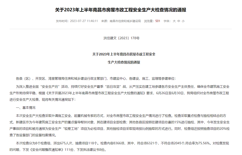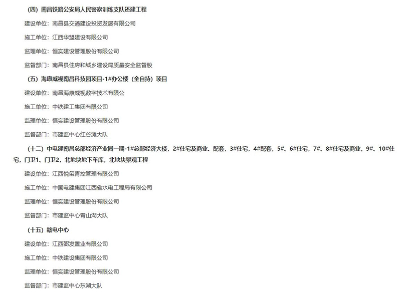为深入推进全国“安全生产月”活动,持续打好安全生产夏季“百日攻坚”战,严格压实在建工地参建各方安全生产主体责任,确保全市建筑施工安全生产形势持续平稳,近日,南昌市住房和城乡建设局对全市房屋市政工程进行安全生产大检查,由恒实建设管理股份有限公司监理的南昌铁路公安局人民警察训练支队还建工程、海康威视南昌科技园项目-1#办公楼(全自持)项目、中电建南昌总部经济产业园一期、赣电中心等4个项目获评“较好工地”称号。