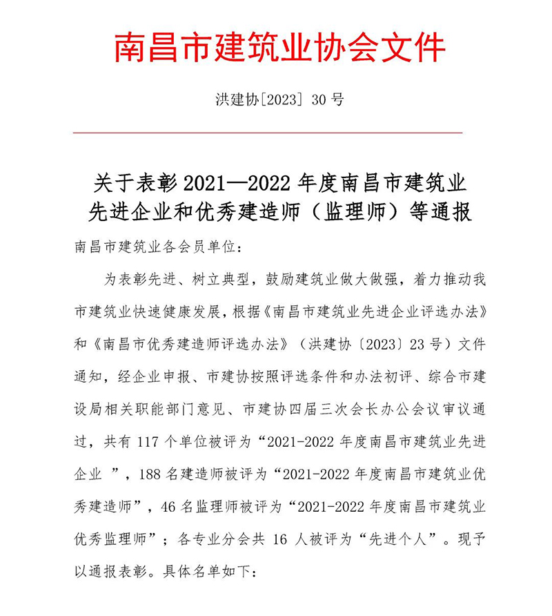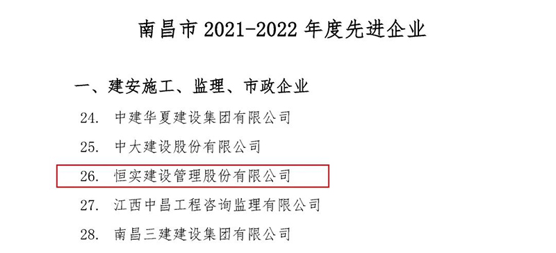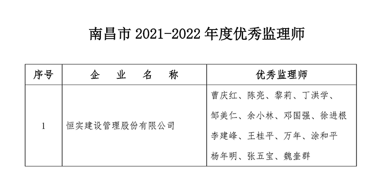 为表彰先进、树立典型,鼓励建筑业做大做强,着力推动我市建筑业快速健康发展,近日,南昌市建筑业协会发布了《关于表彰2021—2022年度南昌市建筑业先进企业和优秀建造师(监理师)等通报》,经评定,恒实建设管理股份有限公司荣获“2021—2022年度南昌市建筑业先进企业”荣誉称号;共有15名监理师荣获“优秀监理师”称号,是获评人数最多的企业。