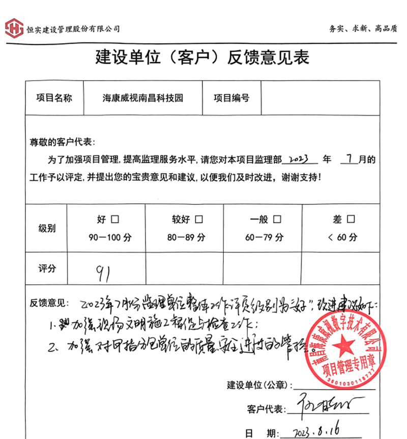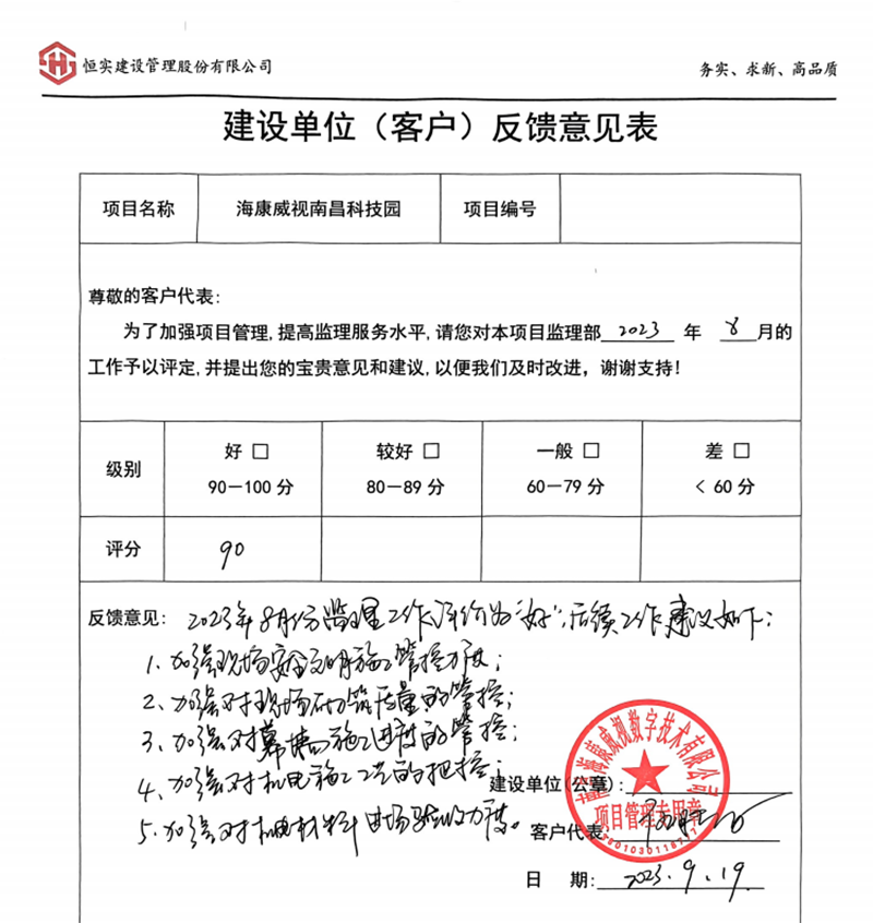 恒实股份践行“做完美工程的守护者”的使命,为项目建设保驾护航,对工程安全和品质有着执着的追求和绝对的恪守;质量安全中心将持续深入项目一线,做好宣贯巡检工作,坚持“务实 求新 高品质”的价值观,充分发挥行业示范引领作用,不断提升建筑工程品质,建设优质精品工程。