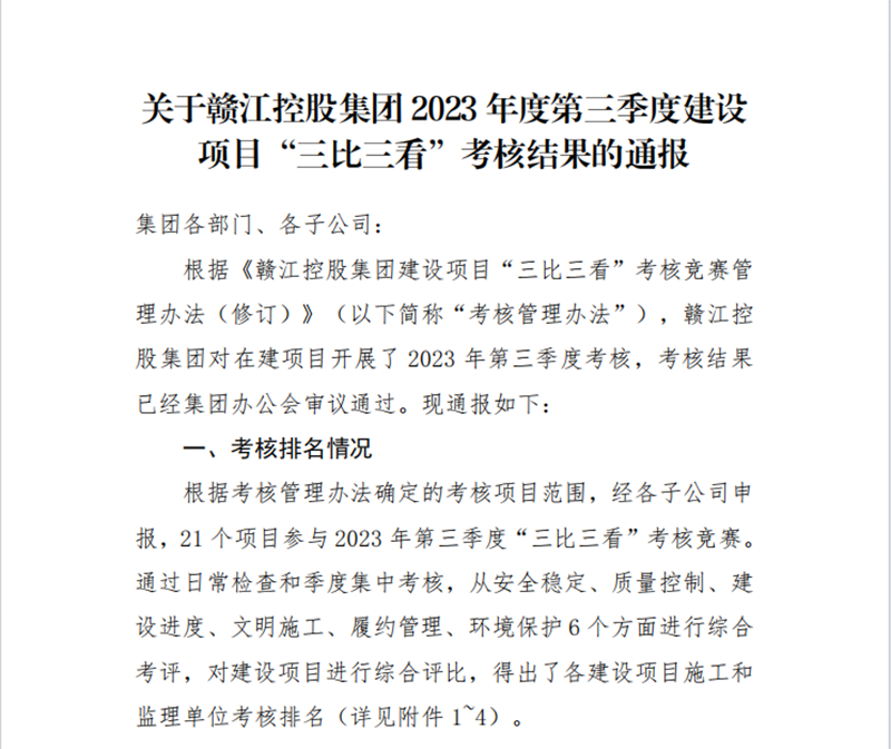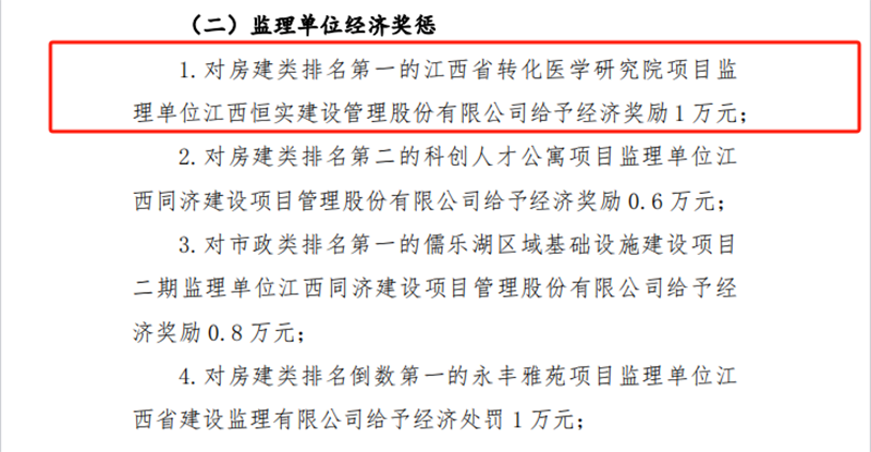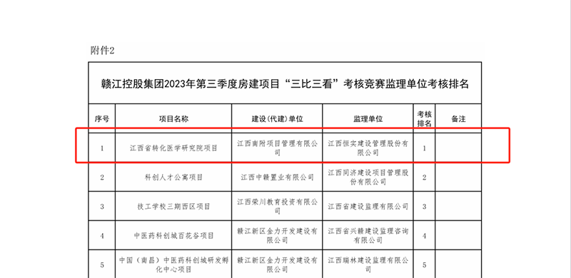 11月13日,赣江控股集团有限公司发布了《关于赣江控股集团 2023年度第三季度建设项目“三比三看”考核结果的通报》,由恒实建设管理股份有限公司监理的江西省转化医学研究院项目荣获房建项目监理单位考核竞赛排名第一。