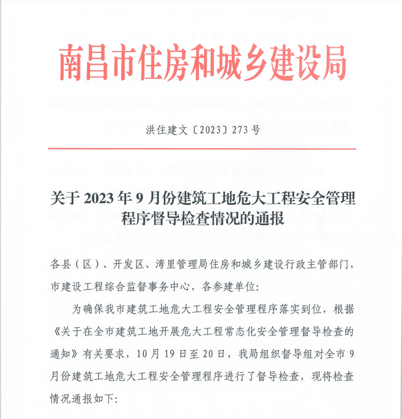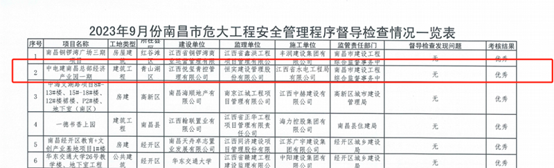 为确保建筑工地危大工程安全管理程序落实到位,近日,南昌市住建局发布了《关于2023年9月份建筑工地危大工程安全管理程序督导检查情况的通报》,由恒实建设管理股份有限公司监理的中电建南昌总部经济产业园一期项目督导检查发现无问题,考核结果优秀。