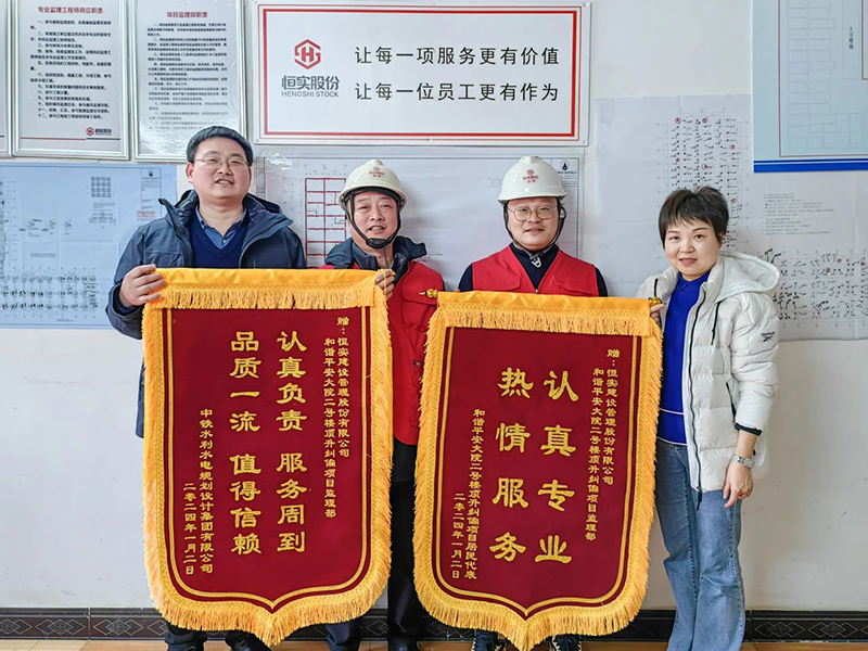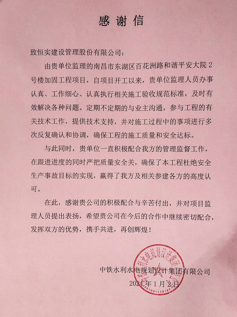 新年第一个工作日,恒实建设管理股份有限公司监理的南昌市东湖区百花洲路和谐平安大院2号楼加固工程收到了两面荣誉锦旗和感谢信:业主单位中铁水利水电规划设计集团有限公司赠予“认真负责 服务周到 品质一流 值得信赖”锦旗和感谢信;居民代表赠予“认真专业 热情服务”锦旗。