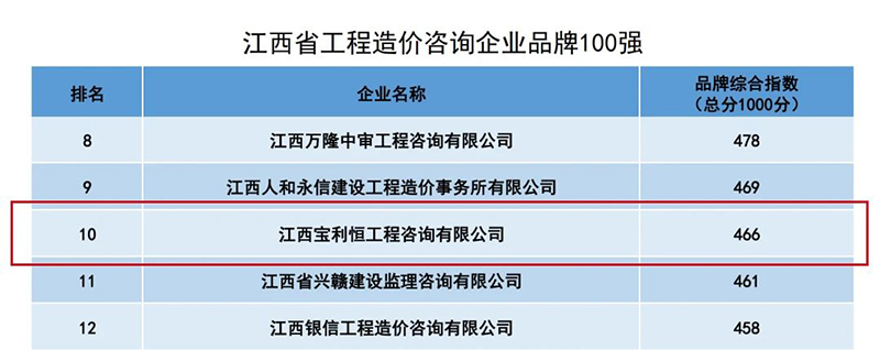 近日,2023江西省工程造价咨询企业品牌100强榜正式公布,恒实股份控股子公司江西宝利恒工程咨询有限公司位列排名全省第十,品牌综合指数466分。