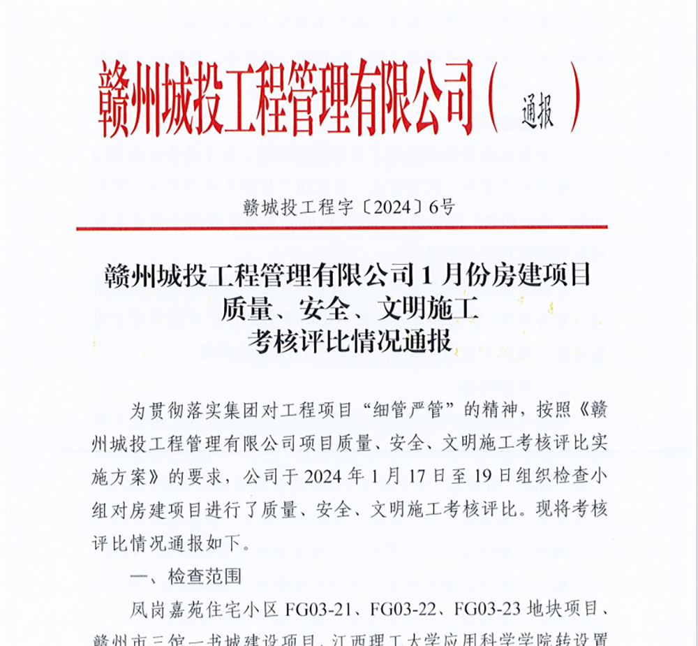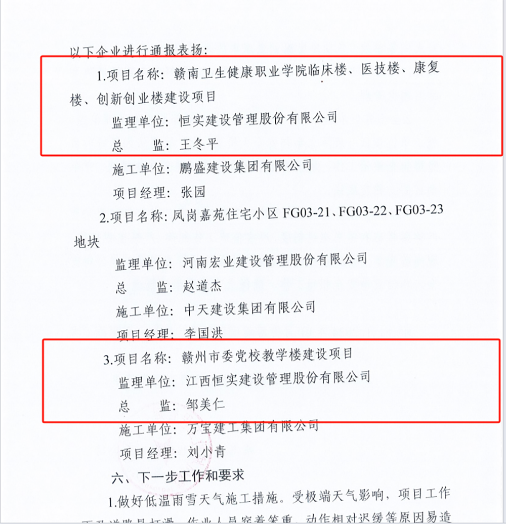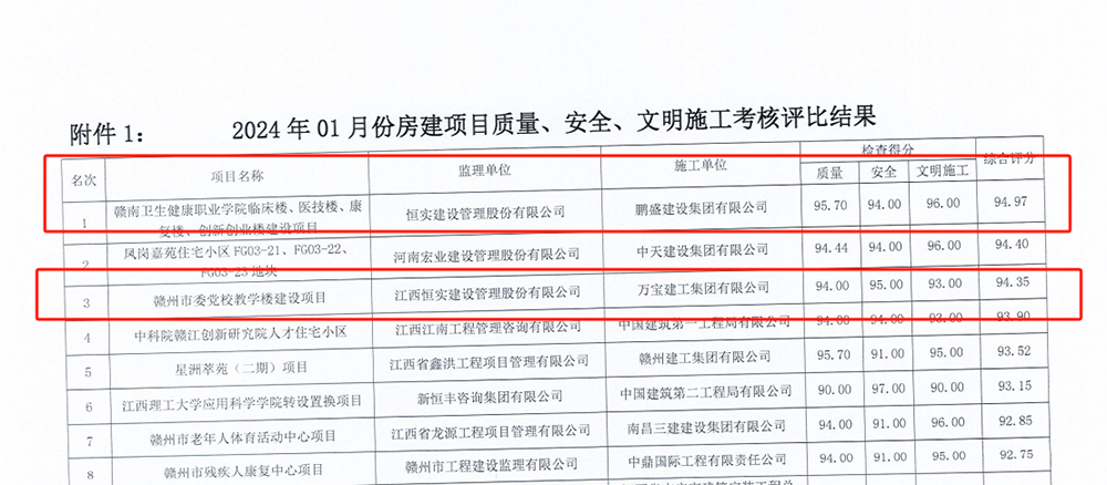 近日,赣州城投工程管理有限公司《1月份房建项目质量、安全、文明施工考核评比情况通报》,根据严格公正的综合考评,由恒实建设管理股份有限公司监理的赣南卫生健康职业学院临床楼、医技楼、康复楼、创新创业楼建设项目,赣州市委党校教学楼建设项目管理突出获得表扬,且赣南卫生健康职业学院临床楼等建设项目考核评分第一名。
