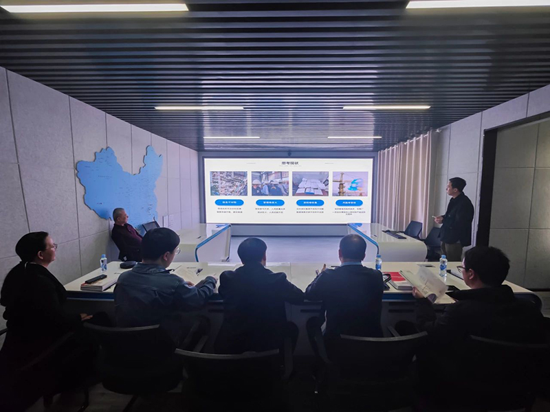 在企业指挥中心,技术研发中心秦川介绍了公司数字化发展历程及“筑慧云”——建筑产业智慧化云平台,讲解了公司基于建筑全生命周期的“1+2+N”智慧全过程工程服务解决方案,展示了公司自主开发的“易履职”APP在项目日常巡检,资料生成等方面的实际运用。