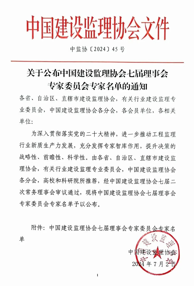 为深入贯彻落实党的二十大精神,进一步推动工程监理行业新质生产力发展,充分发挥专家智库作用,提升决策的战略性、前瞻性、科学性。7月2日,中国建设监理协会发布了七届理事会专家委员会专家名单,其中恒实建设管理股份有限公司董事长贾明成功入选。