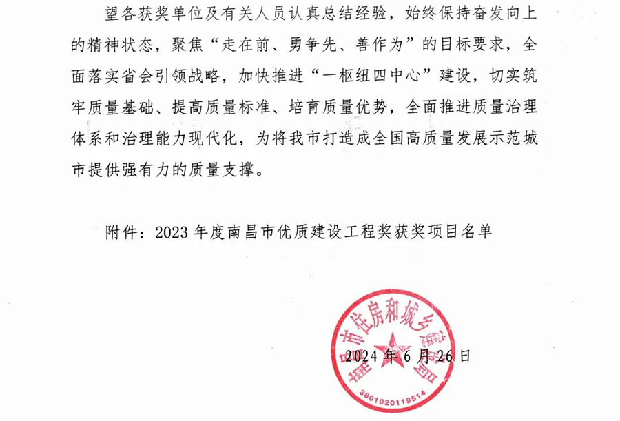 此次项目获得表彰既是对恒实股份狠抓项目质量安全管理推行项目标准化建设的肯定,更是激励企业载誉砥砺前行的动力。恒实股份将继续秉承“做完美工程的守护者”初心使命,进一步强化工程服务意识,让每一项服务更有价值,再铸品质标杆,为推动省会南昌高质量跨越式发展贡献恒实力量。