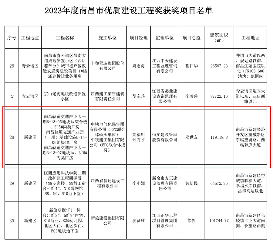 近日,南昌市住房和城乡建设局发布了《关于表彰2023年度南昌市优质建设工程奖获奖项目的通报》,由恒实建设管理股份有限公司提供监理服务的:南昌轨道交通产业园一期B-13-05地块1#综合楼、2~5#丙类厂房,南昌轨道交通产业园(一期)基础设施B-14-06地块1#厂房,南昌轨道交通产业园一期B-13-07地块1#、3~6#丙类厂房项目获得表彰,被评为“2023年南昌市优质建设工程奖”。