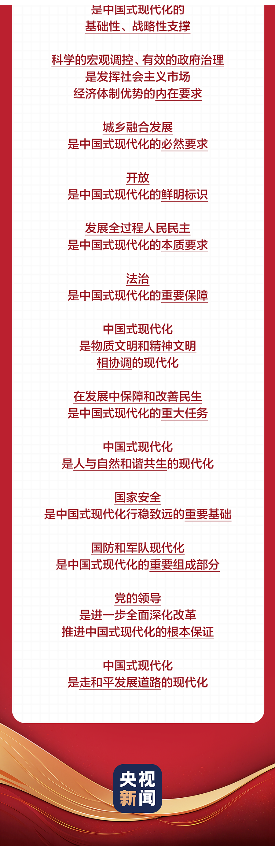 全会强调,进一步全面深化改革,必须坚持马克思列宁主义、毛泽东思想、邓小平理论、“三个代表”重要思想、科学发展观,全面贯彻习近平新时代中国特色社会主义思想,深入学习贯彻习近平总书记关于全面深化改革的一系列新思想、新观点、新论断,完整准确全面贯彻新发展理念,坚持稳中求进工作总基调,坚持解放思想、实事求是、与时俱进、求真务实,进一步解放和发展社会生产力、激发和增强社会活力,统筹国内国际两个大局,统筹推进“五位一体”总体布局,协调推进“四个全面”战略布局,以经济体制改革为牵引,以促进社会公平正义、增进人民福祉为出发点和落脚点,更加注重系统集成,更加注重突出重点,更加注重改革实效,推动生产关系和生产力、上层建筑和经济基础、国家治理和社会发展更好相适应,为中国式现代化提供强大动力和制度保障。