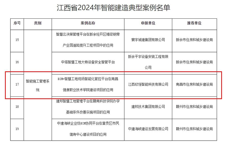 7月31日,江西省住房和城乡建设厅发布了《关于公布江西省2024年智能建造典型案例的通知》,其中,江西欣恒智能科技有限公司联合中国建筑一局(集团)有限公司共同申报的"BIM+智慧工地现场智能化管控平台在南昌健康职业技术学院建设项目的应用"榜上有名,入选为江西省2024年智能建造典型案例。