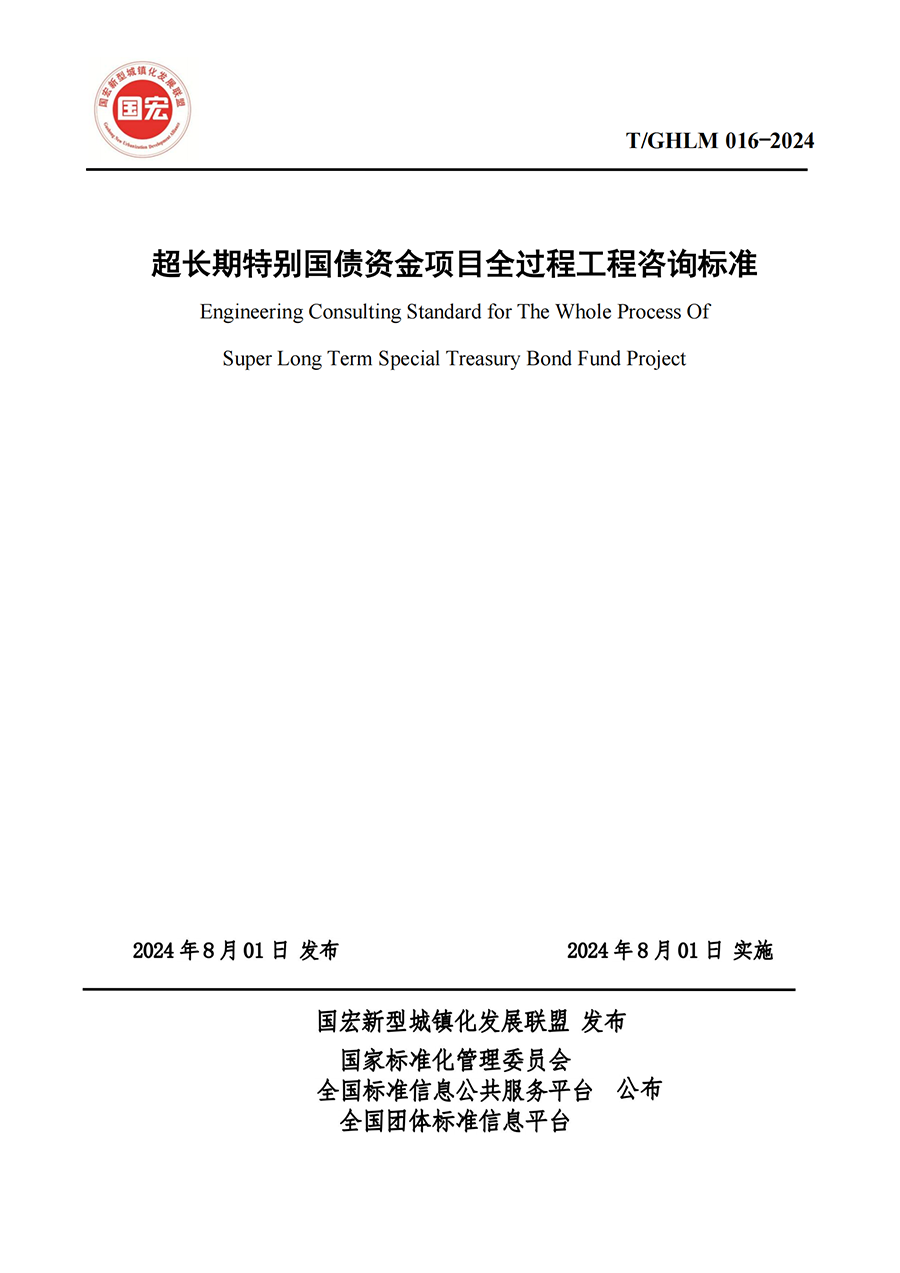 为响应习近平总书记“标准助推创新发展,标准引领时代进步”关于标准化的重要指示精神,深入贯彻中国共产党二十届三中全会《中共中央关于进一步全面深化改革 推进中国式现代化的决定》、《中华人民共和国国民经济和社会发展第十四个五年规划和2035年远景目标纲要》、《国家新型城镇化规划2021-2035》、《“十四五”新型城镇化实施方案》、国务院《深入实施以人为本的新型城镇化战略五年行动计划》的通知,落实《2024年中央政府工作报告》中深入推进新型城镇化战略的要求。根据《国家标准化法》《国家标准化发展纲要》、国家发改委《深化标准化工作改革方案》、国家发改委等六部委《城市标准化行动方案》、国家发改委 国家标准化委员会 住房城乡建设部《关于开展新型城镇化标准体系建设工作的指导意见》、国家标准化管理委员会《新型城镇化标准化试点项目管理办法》要求,落实《国务院办公厅关于促进建筑业持续健康发展的意见》(国办发〔2017〕19号)、《国家发改委 住房城乡建设部关于推进全过程工程咨询服务发展的指导意见》(发改投资规〔2019〕515号)“研究建立全过程工程咨询服务技术标准体系,促进全过程工程咨询服务科学化、标准化和规范化”的要求,为推进我国超长期特别国债资金项目全过程工程咨询服务的高质量发展,国宏新型城镇化发展联盟作为经政府审批设立的开展新型城镇化研究、制定专业标准的社会组织,应市场需求,立项了《超长期特别国债资金项目全过程工程咨询标准》。
