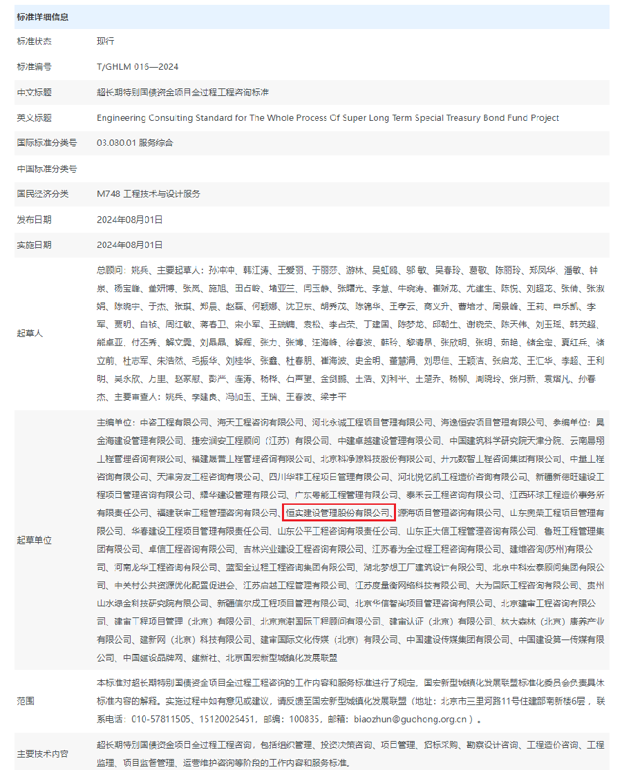 日前,经国宏联盟标准化委员会评审,国家标准化管理委员会全国标准信息公共服务平台公布,由恒实建设管理股份有限公司作为主要参编单位参与编制的《超长期特别国债资金项目全过程工程咨询标准》现正式发布实施,标准编号为T/GHLM016-2024,自8月1日起生效施行。