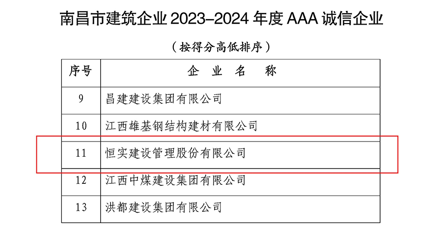 8月26日,根据南昌市建筑业协会《洪建协〔2024〕7号》 文件“关于开展南昌市2023-2024年度建筑业企业诚信评价工作的通知”精神和《南昌市建筑业企业诚信评价办法》,经企业自愿申报,协会核实初评、评审委员会审议通过,确定南昌市建筑业2023-2024年度“AAA 诚信企业”74家、“诚信企业”25家。其中,恒实建设管理股份有限公司荣获南昌市建筑业企业2023-2024年度“AAA诚信企业”荣誉称号,得分位列全市工程咨询企业第一名。