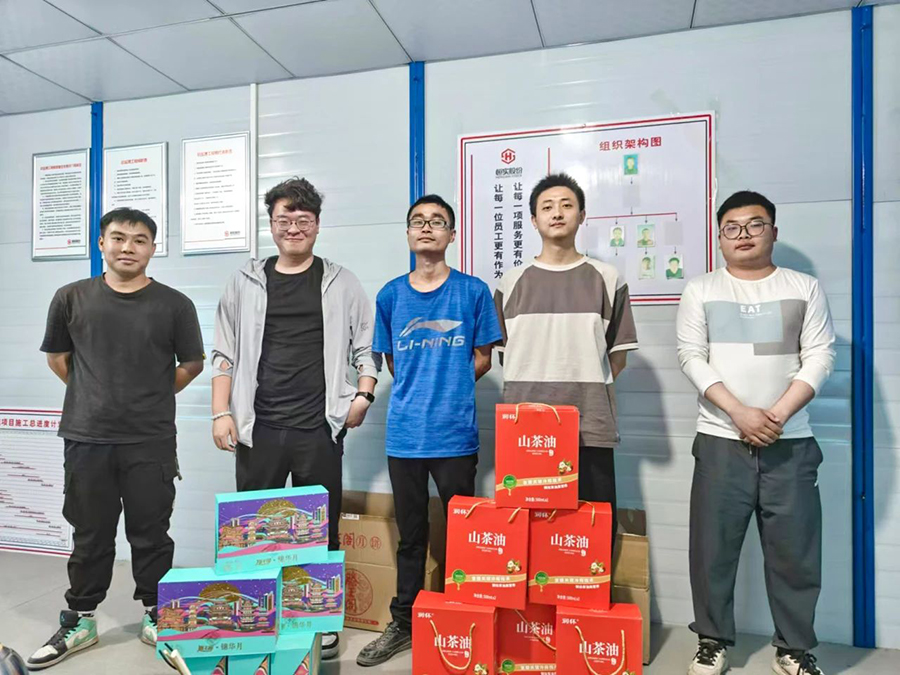 在项目一线福利发放现场上,一份份满载着企业关怀的中秋礼盒送到员工手中。大家的喜悦之情溢于言表,礼品提在手,情谊暖在心。