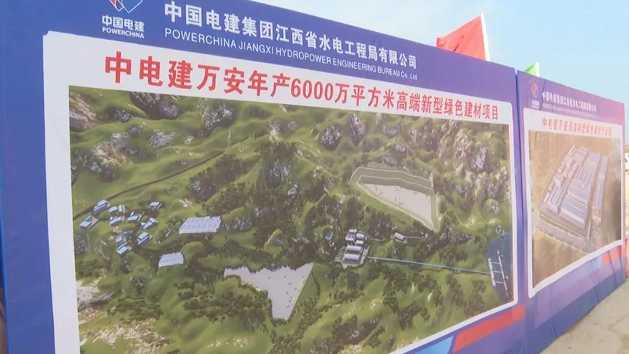 仪式开始前,胡影秋、谢强等观看了中电建万安绿色建材产业园项目建设展板。据了解,项目投资总估算约40.6亿元,占地规划面积1670亩,建设内容包含矿山剥离开采、砂石骨料生产线建安工程、饰面用花岗岩荒料生产线建安工程、绿色矿山建设、办公大楼、生活住宅区、物品保管库及其附属设施。项目建成达产后,纳税约1亿元。