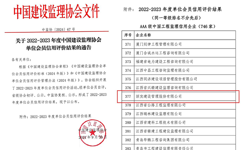 10月11日,中国建设监理协会在郑州召开工程监理行业自律与诚信建设大会,会议公布了2022-2023年度中国建设监理协会单位会员信用评价结果,恒实股份凭借优质的企业信誉和过硬的综合实力,成功获评“AAA级中国工程监理信用企业”。