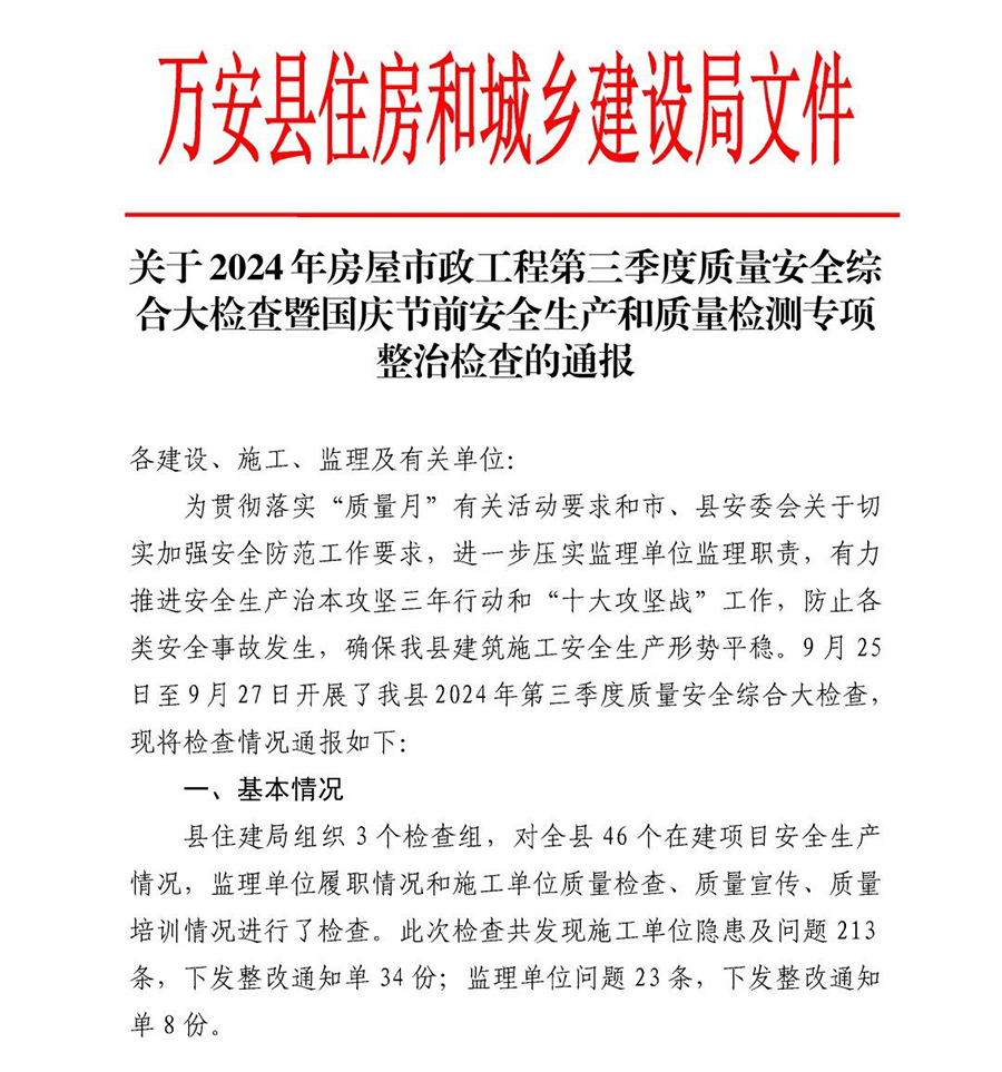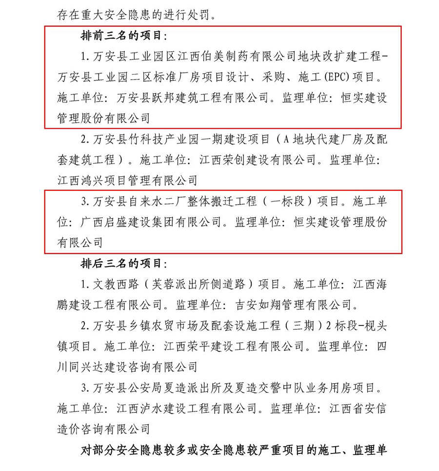 近日,万安县住建局发布了《关于2024年房屋市政工程第三季度质量安全综合大检查暨国庆节前安全生产和质量检测专项整治检查的通报》,由恒实建设管理股份有限公司监理的万安县工业园区江西伯美制药有限公司地块改扩建工程—万安县工业园二区标准厂房项目设计、采购、施工(EPC)项目排名全县第一,万安县自来水二厂整体搬迁工程(一标段)项目排名全县第三,获得上红榜并全县通报表扬。