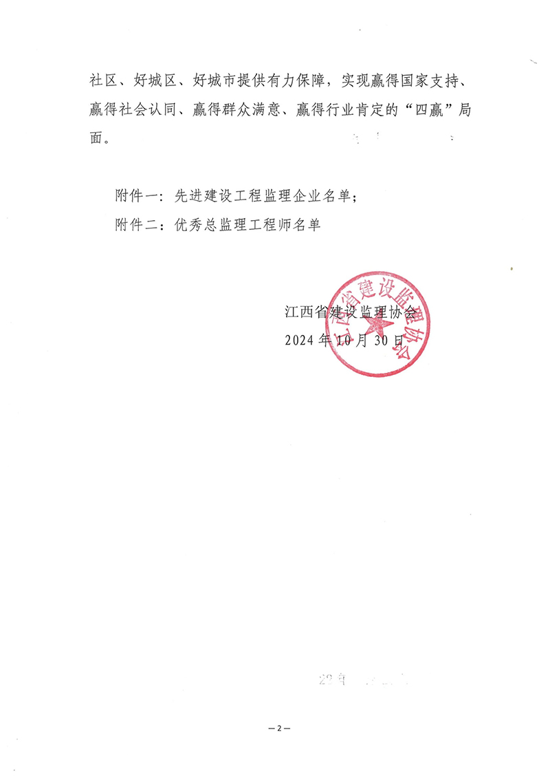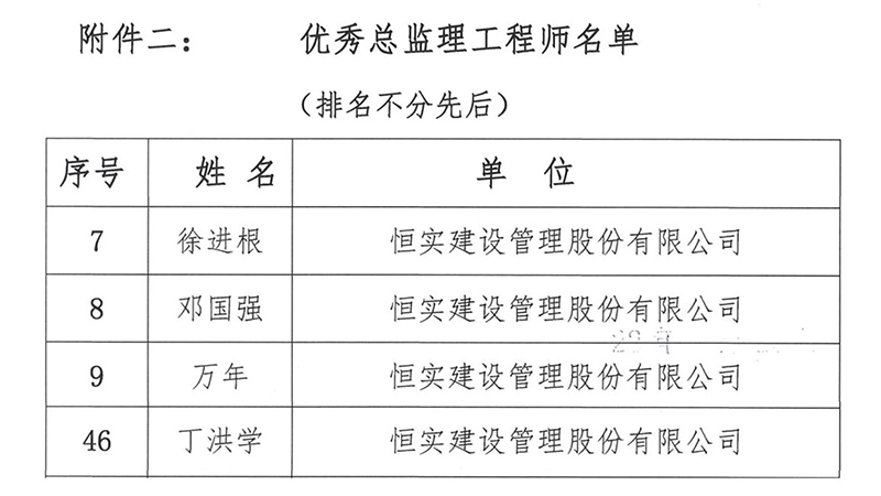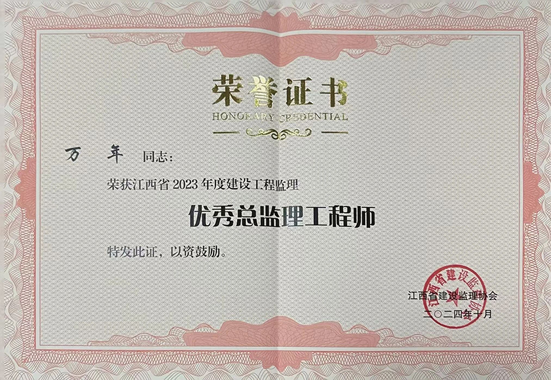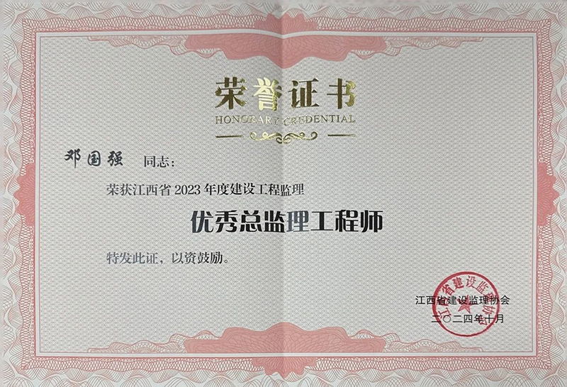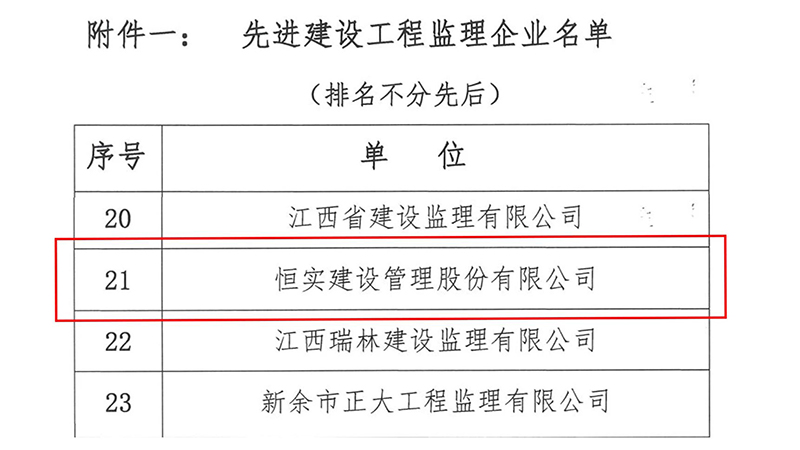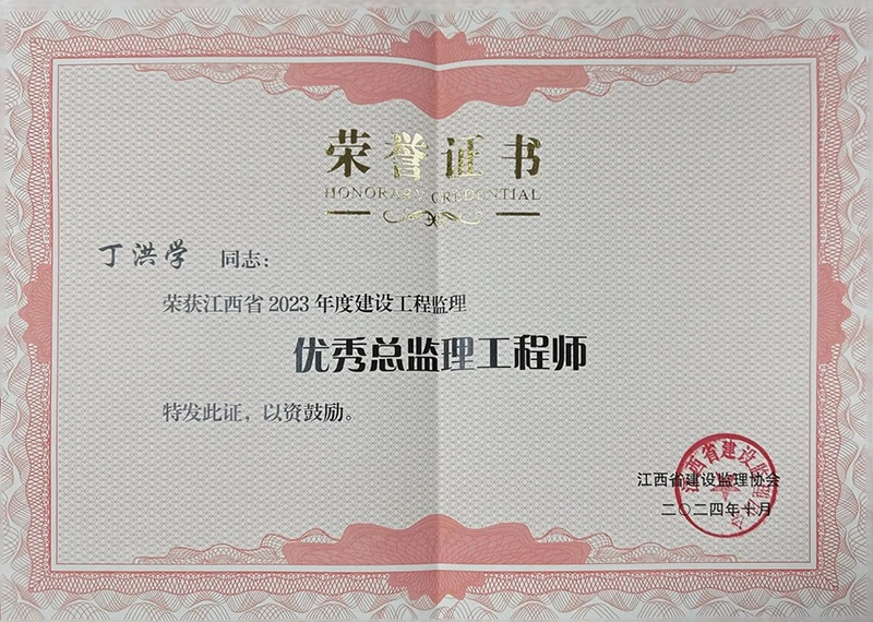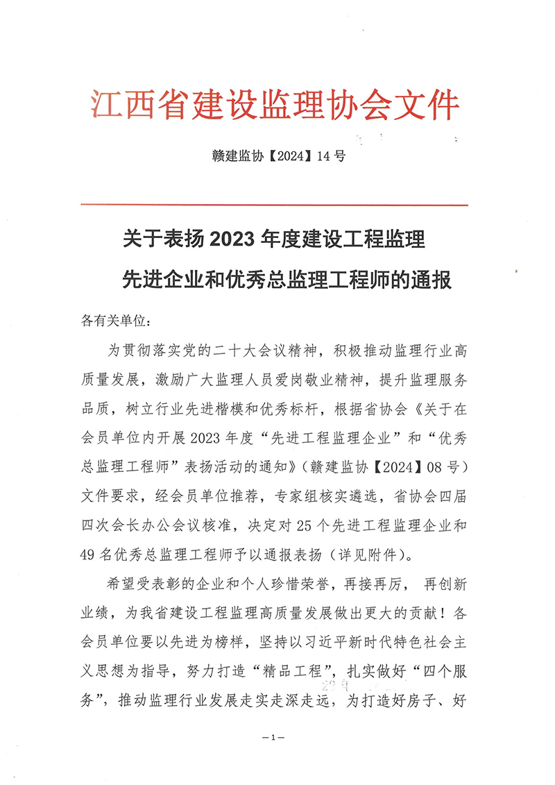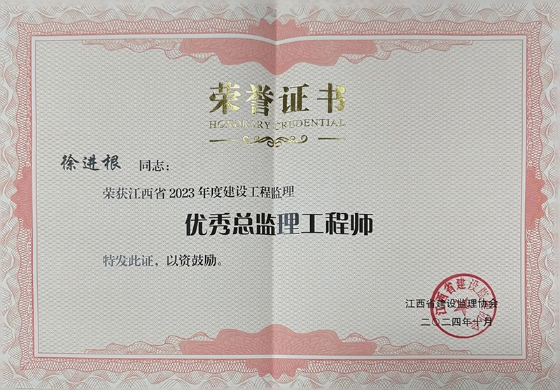 近日,为贯彻落实党的二十大会议精神,积极推动监理行业高质量发展,激励广大监理人员爱岗敬业精神,提升监理服务品质,树立行业先进楷模和优秀标杆,江西省建设监理协会发布了《关于表扬2023年度建设工程监理先进企业和优秀总监理工程师的通报》,其中,恒实建设管理股份有限公司荣获“先进建设工程监理企业”荣誉,徐进根、邓国强、万年、丁洪学四位总监理工程师荣获“优秀总监理工程师”称号。