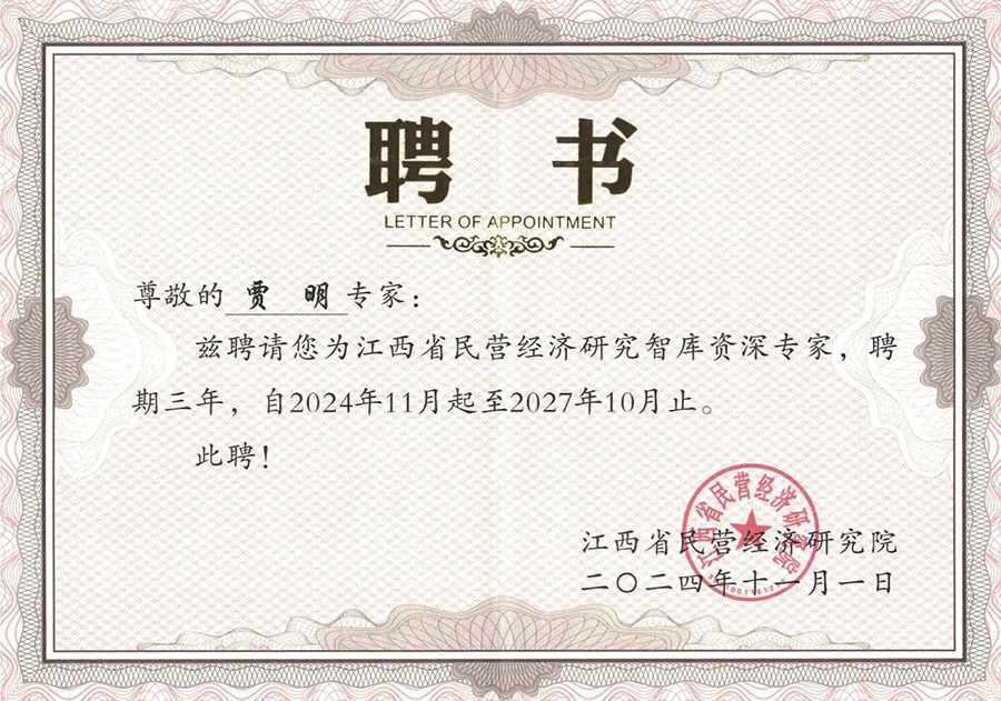 此次专家入库将参与江西省工商联举办的各类型调查研究、专题研讨、学术沙龙、专题讲座、方案论证、课题评审、决策咨询、专题座谈会或论坛等活动。为其谏诤言、献良策,做政府的参谋,贡献智库力量,为企业护航,推动项目落地,服务行业与区域经济高质量发展,为江西省民营经济高质量发展提供助力。