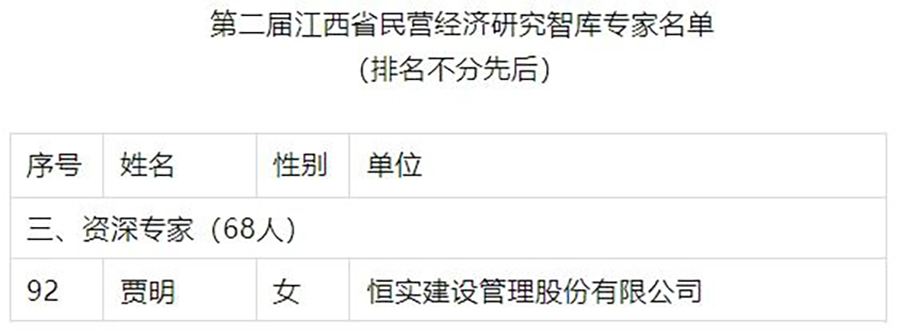 近日,江西省工商联发布《第二届江西省民营经济研究智库专家、研究点拟聘名单公示》,经过严格审核和筛选,恒实建设管理股份有限公司董事长贾明获聘为第二届江西省民营经济研究智库资深专家。