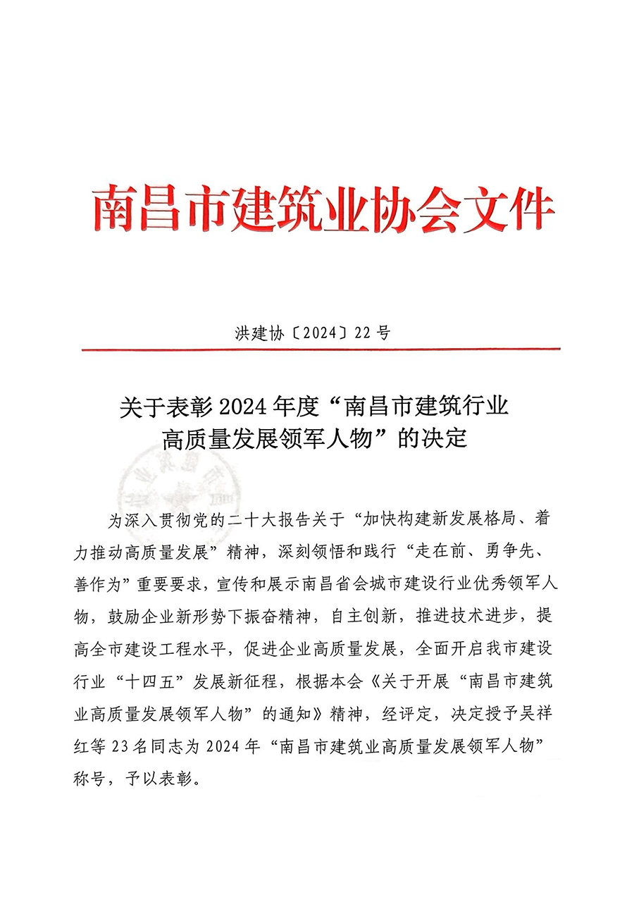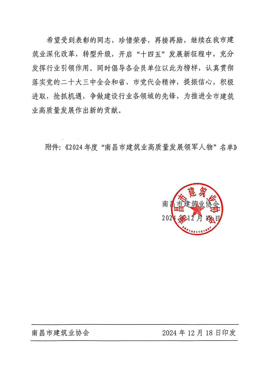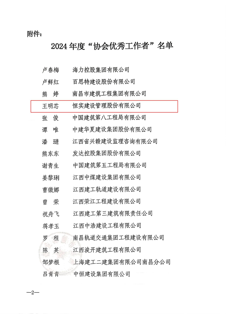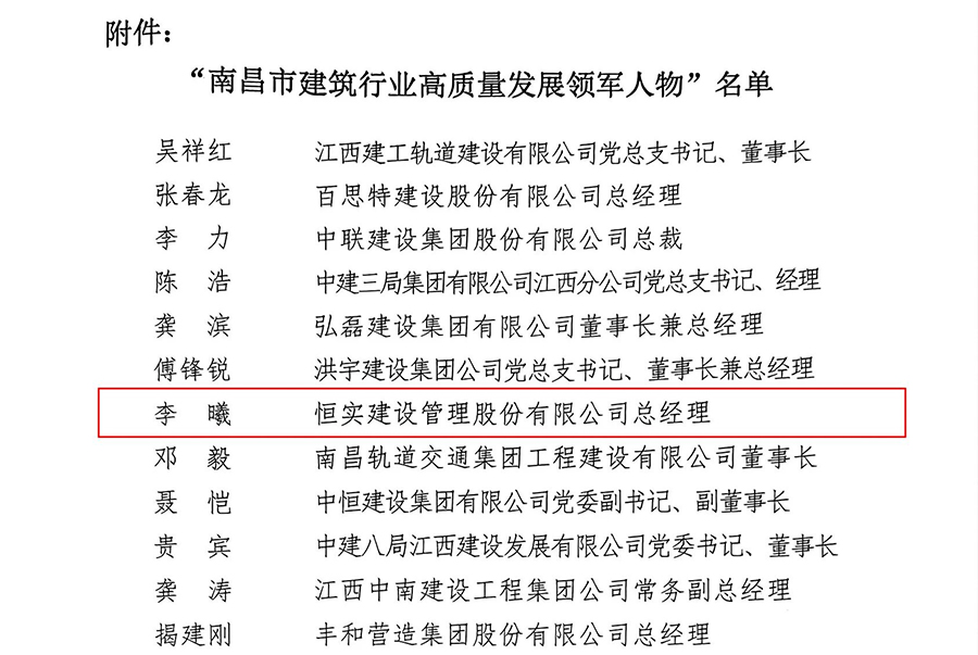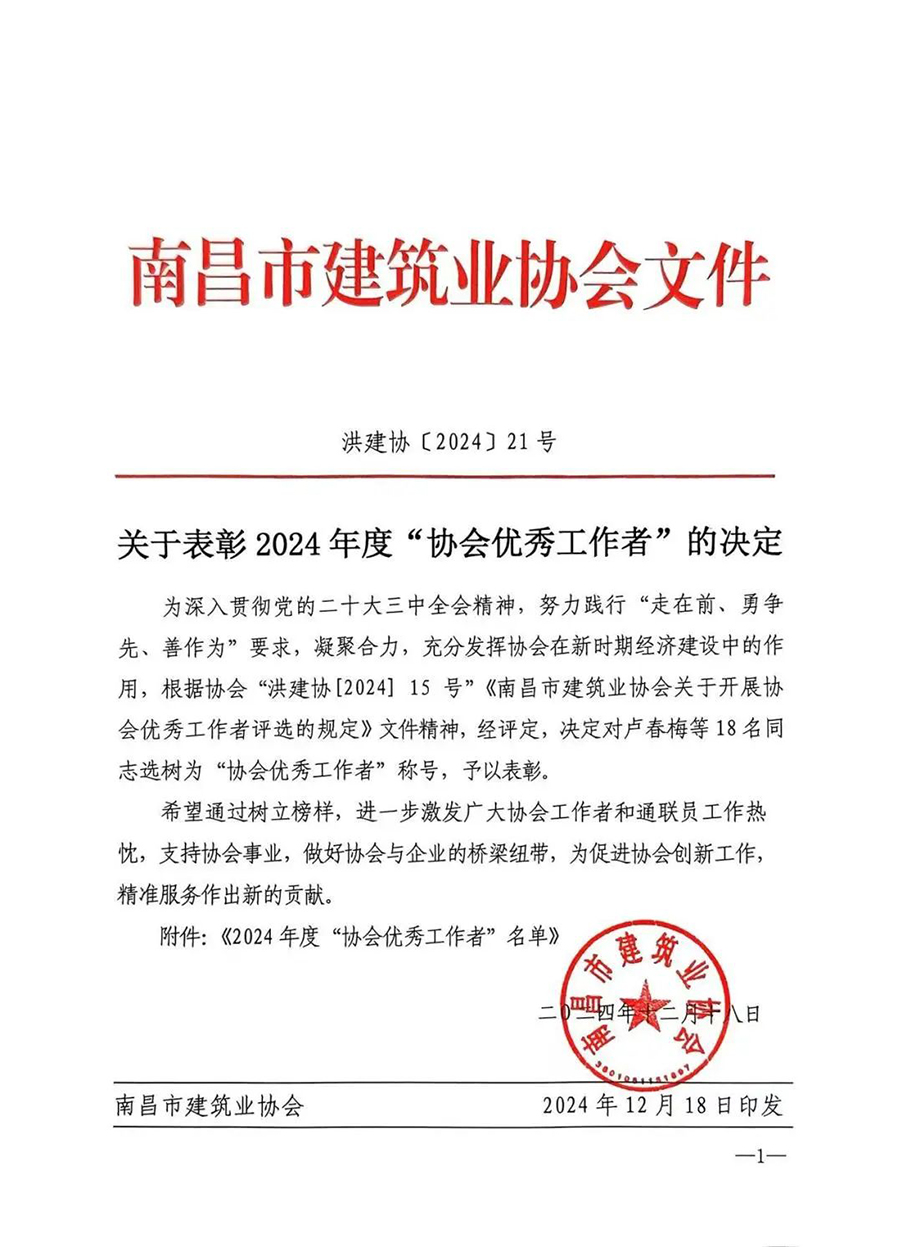 会上发布了《关于表彰2023年至2024年度“南昌市建筑行业高质量发展领军人物”的决定》和《关于表彰2024年度协会优秀工作者的决定》,其中恒实股份总经理李曦荣获2024年“南昌市建筑业高质量发展领军人物”称号;王明芯荣获“协会优秀工作者”称号。