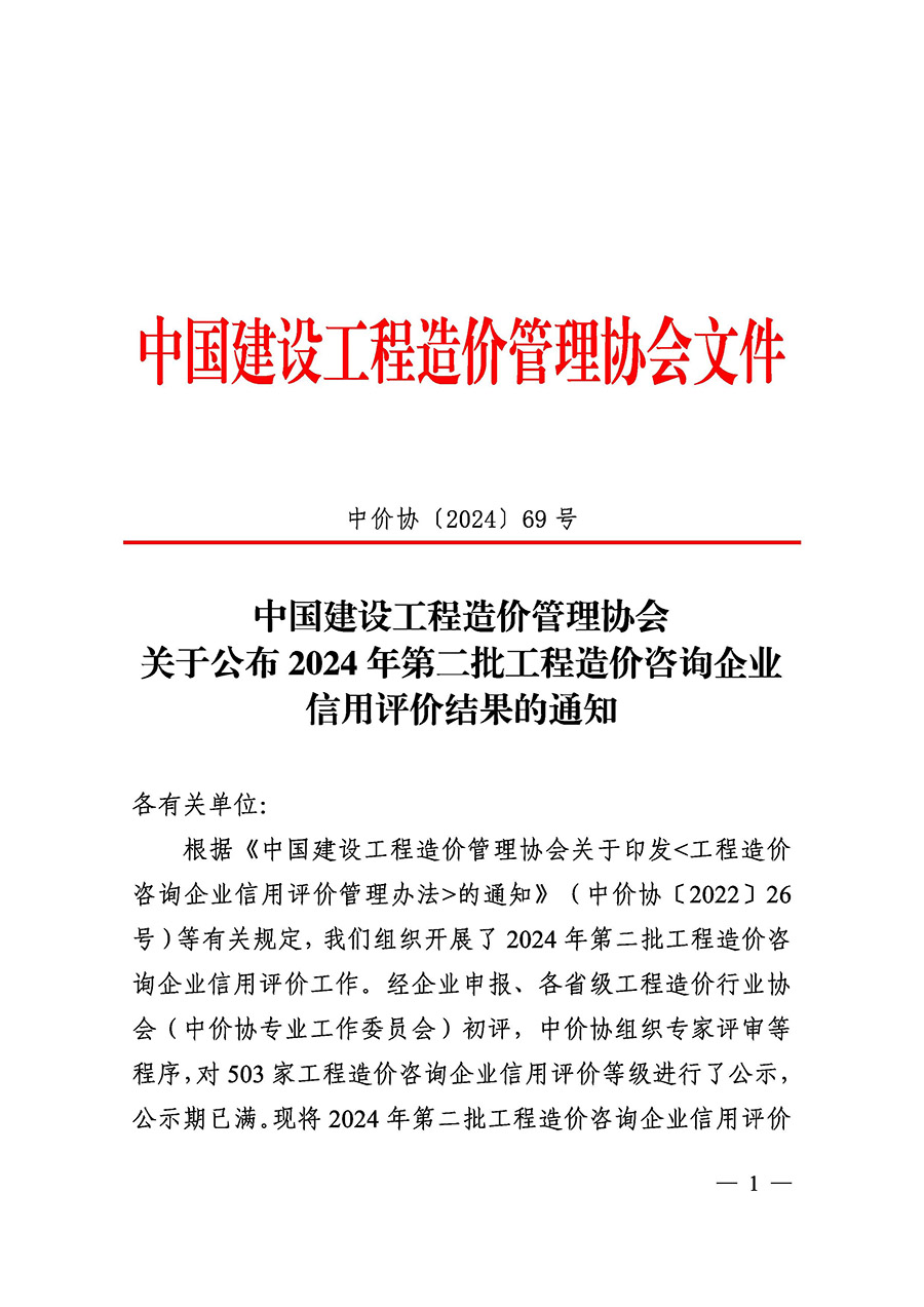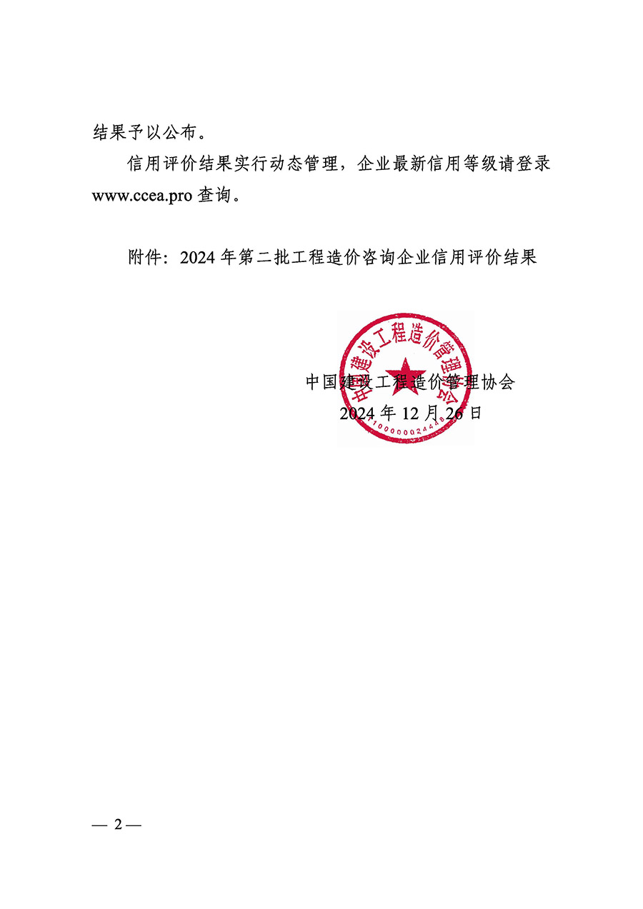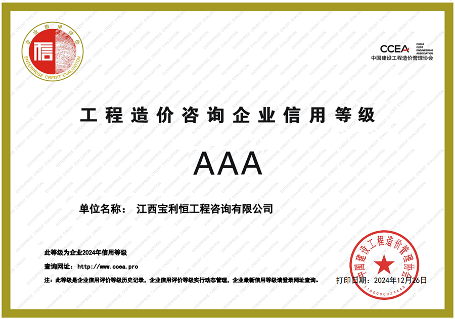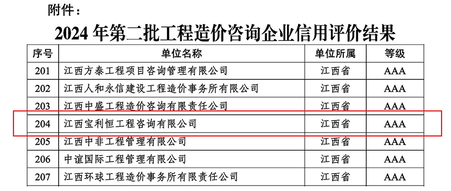 12月26日,中国建设工程造价管理协会《关于公布2024年第二批工程造价咨询企业信用评价结果的通知》,经过材料审查、专家评审、网上公示等工作,江西宝利恒工程咨询有限公司再次取得AAA级工程造价咨询企业信用评价。