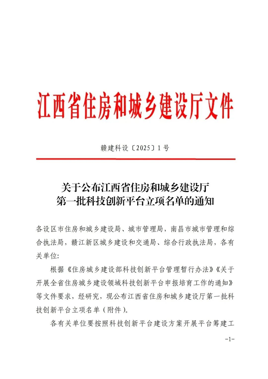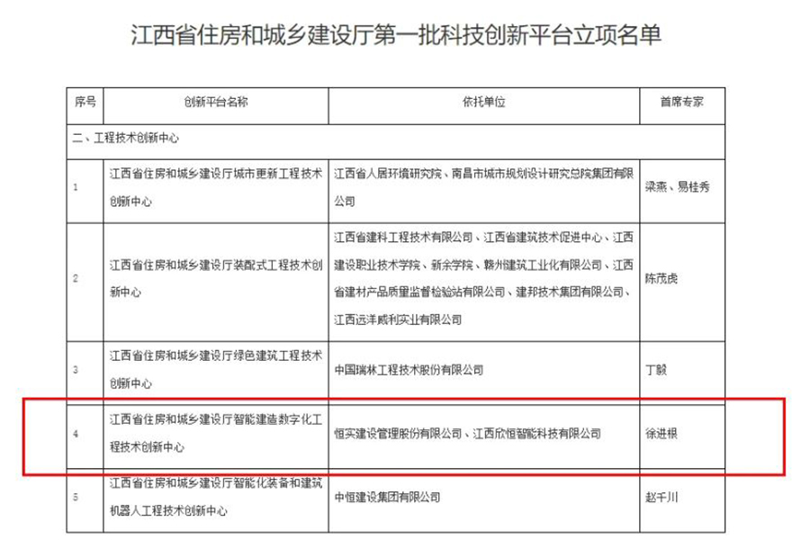 近日,江西省住房和城乡建设厅公布了第一批科技创新平台立项名单。其中,由恒实建设管理股份有限公司和全资子公司江西欣恒智能科技有限公司共同申报的江西省住房和城乡建设厅智能建造数字化工程技术创新中心成功获批立项。