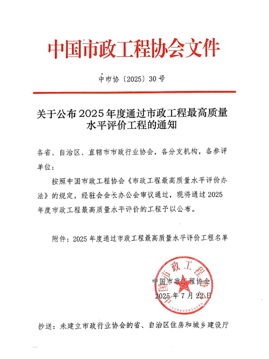据悉,市政工程最高质量水平评价(原全国市政金杯示范工程)由中国市政工程协会组织实施,是中国市政工程建设领域质量方面的最高荣誉,旨在通过严格的标准和评审程序,遴选出在设计、施工、管理、技术创新及综合效益等方面均达到国内顶尖水平的市政工程项目。