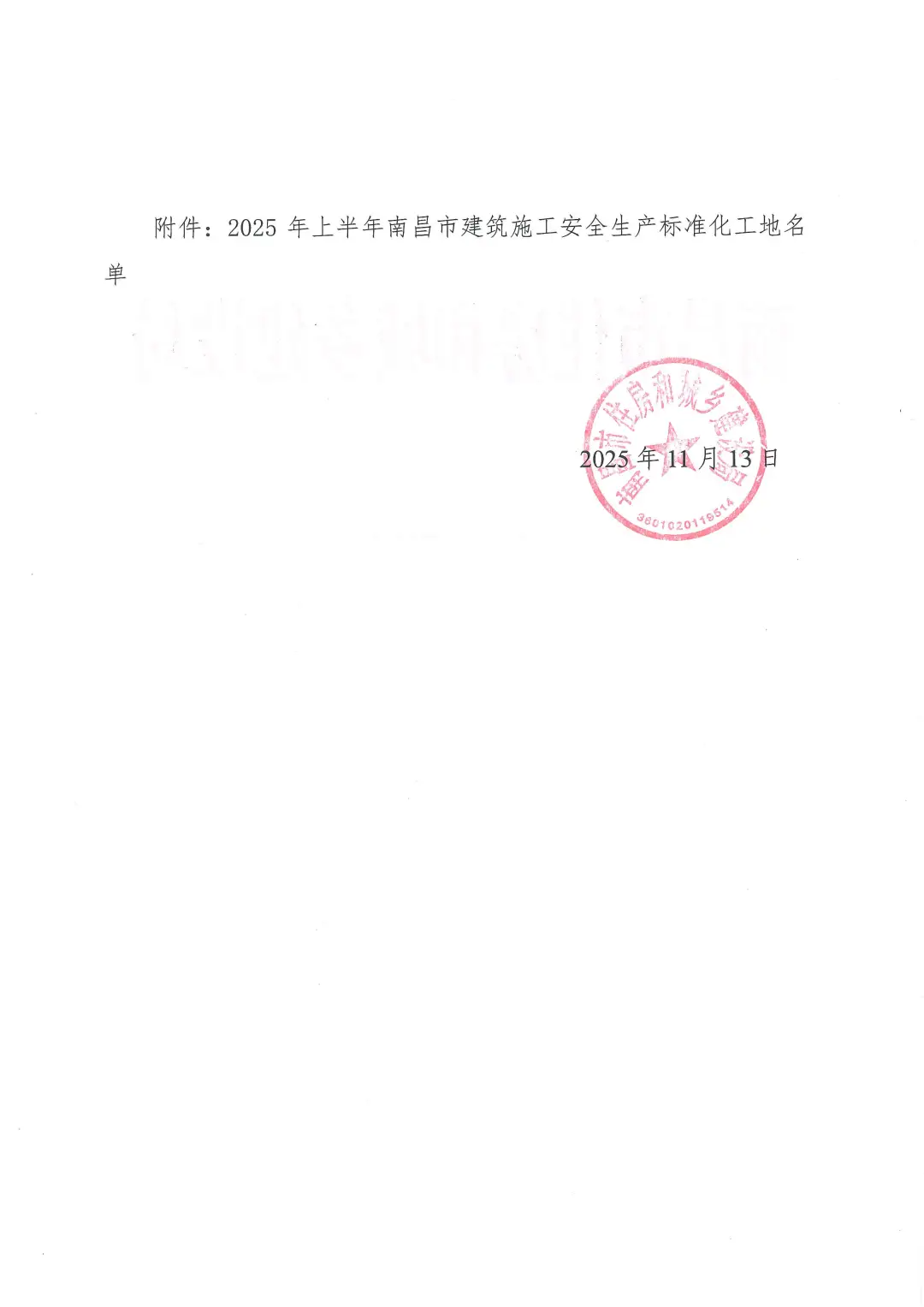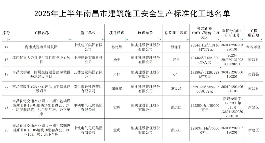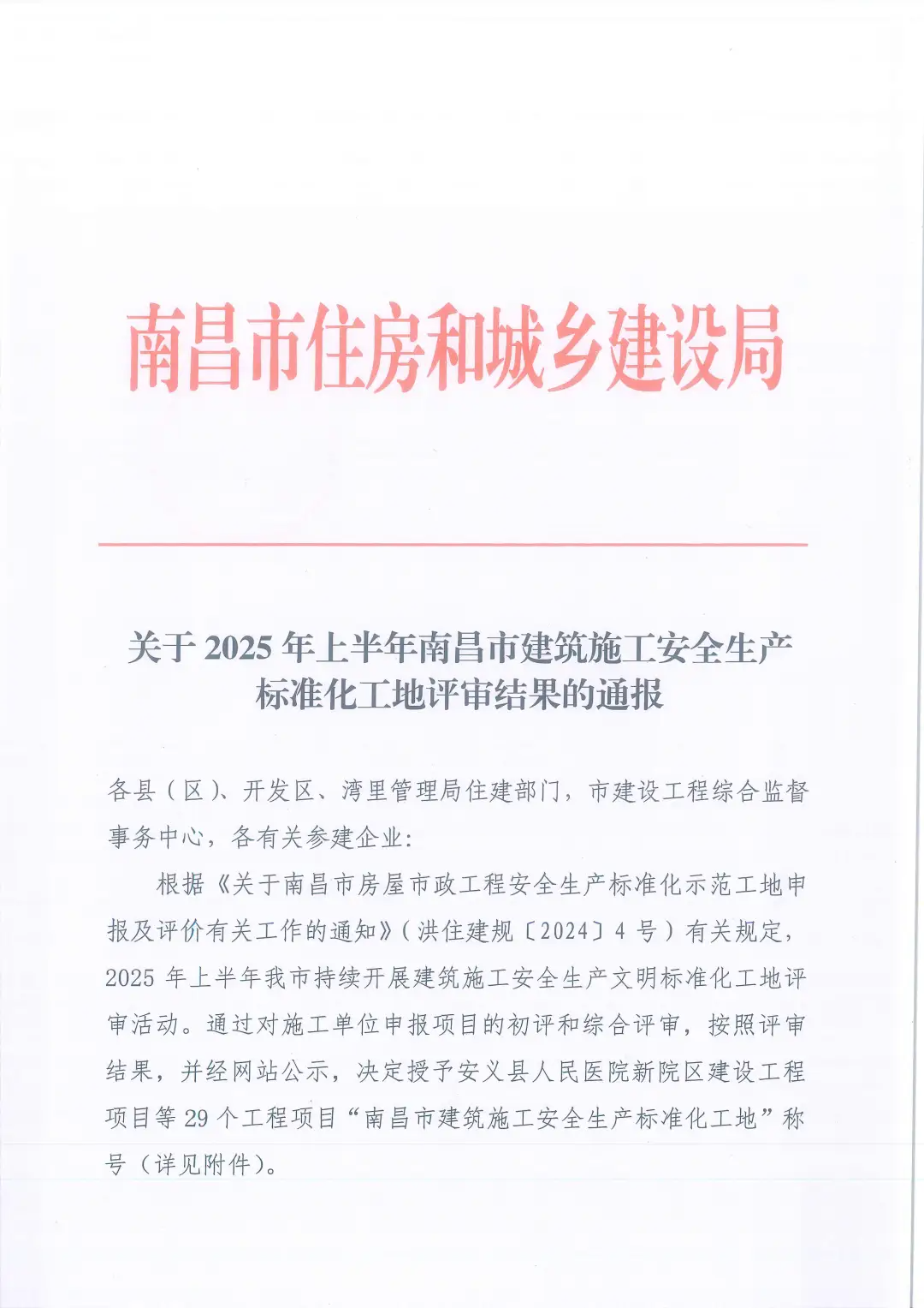 近日,南昌市住房与城乡建设局通报了《关于2025年上半年南昌市建筑施工安全生产标准化工地评审结果的通报》,经过对申报项目的初评和综合评审,由恒实股份监理的海康威视南昌科技园、江西省重大公共卫生事件医学中心项目、南昌大学第一附属医院紧急医学救援基地建设项目、南昌市政生态农业农产品加工基地建设项目、南昌轨道交通产业园(一期)基础设施项目B-13-04地块、南昌轨道交通产业园(一期)基础设施项目B-13-06地块6个项目榜上有名,是获评项目最多的监理单位。