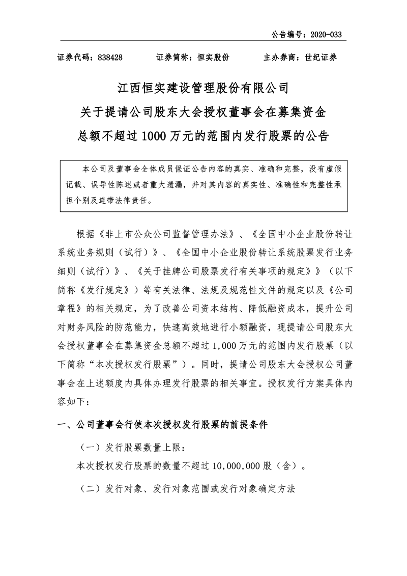 关于提请公司股东大会授权董事会在募集资金总额不超过1000万元的范围内发行股票的公告