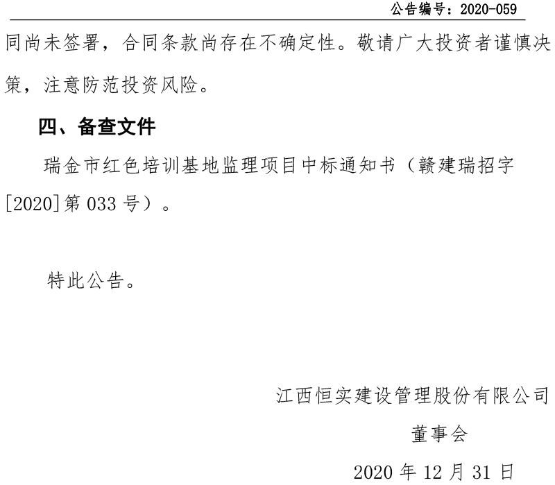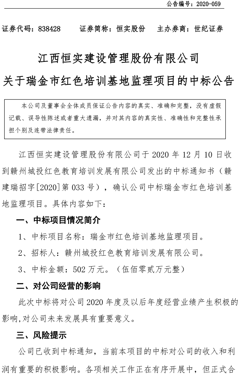 恒实股份:瑞金市红色培训基地监理项目的中标公告